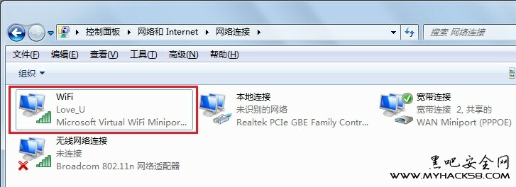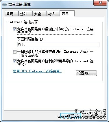 2、設(shè)置共享。在 網(wǎng)絡(luò)和共享中心 中,點(diǎn)擊左側(cè) 更改適配器配置,進(jìn)入 網(wǎng)絡(luò)連接 界面。選中寬帶連接后,右鍵查看其屬性,進(jìn)入 共享 選項(xiàng)卡,勾選 允許其他網(wǎng)絡(luò)用戶通過此計(jì)算機(jī)的Internet來連接,然后 家庭網(wǎng)絡(luò)連接 項(xiàng)選擇Connectify之前建立的WiFi連接,即WiFi。設(shè)置后的情況見下圖: