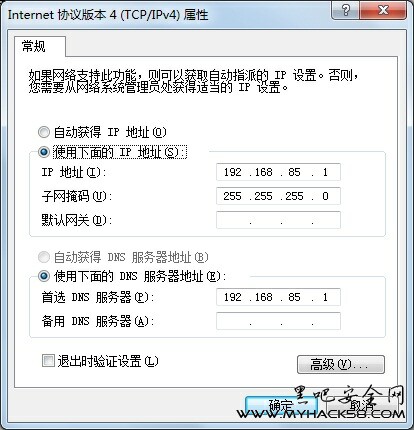 5、查看Connectify之前建立的WiFi連接。首先回到Connectify,點(diǎn)擊Start Hotspot,等待其建立連接后,依舊在 網(wǎng)絡(luò)連接 窗口中,右鍵 WiFi,進(jìn)入其屬性界面;雙擊 Internet 協(xié)議版本 4(TCP/IPv4),進(jìn)入TCP/IP設(shè)置界面;查看其IP地址,記下來,一般為192.168.xxx.1,我的是192.168.85.1,下文均以此IP地址為例進(jìn)行講解。如下圖: