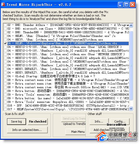 把這上圖中,后面的參數(shù)刪除后,發(fā)面依然不能修改過來,這時,我猜想到IE瀏覽器被劫持了,加載項中肯定加載了某個程序或腳本。從網(wǎng)上下載了趨勢的hijackthis這款軟件,運行掃描IE瀏覽加載項,果不出所料,發(fā)現(xiàn)了IE瀏覽器在運行時加載了一個vbs腳本: