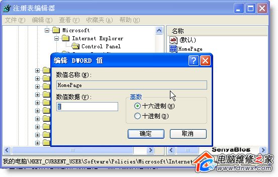 出現(xiàn)這種狀況,是因為注冊表[HKEY_CURRENT_USER\Software\Policies\Microsoft\Internet Explorer\Control Panel]項下的“HomePage”值為1(HomePage值類型是DWORD),把它改為0即可。