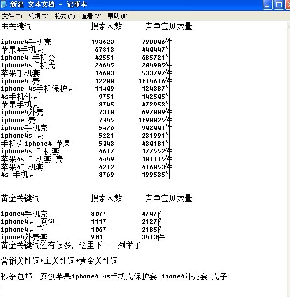這些關(guān)鍵詞都是搜索量大,且和寶貝不沖突的相關(guān)關(guān)鍵詞,把這些關(guān)鍵詞全部融合到一個標(biāo)題里面,“秒殺包郵!原創(chuàng)蘋果iphone4 4s手機殼保護套ipone4外殼套殼子”剛好64個字符,32個漢字!注意加上營銷關(guān)鍵詞,標(biāo)題要通順。這個標(biāo)題囊括了記事本里面所列出的所有關(guān)鍵詞,當(dāng)你的一個關(guān)鍵詞出現(xiàn)在所有寶貝排名首頁的時候,其他關(guān)鍵詞也差不多會出現(xiàn)在相同位置附近,這樣我們就多了很多關(guān)鍵詞入口。