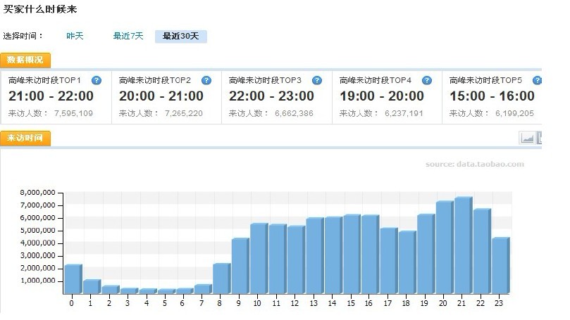 上下架時間和櫥窗推薦,關(guān)系到寶貝是否能夠出現(xiàn)在所有寶貝排名中的前幾頁,寶貝在做了出櫥窗推薦的前提下,離下架時間越近,排名就越靠前。所以寶貝上下架時間,非常關(guān)鍵,我們可以利用數(shù)據(jù)魔方中的“買家什么時候來”,來觀看自己所在類目的流量高峰時間段。