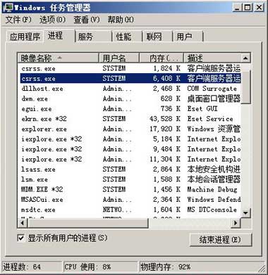1、ntsd -c q -pn 進(jìn)程名。如 ntsd -c q -pn csrss.exe
