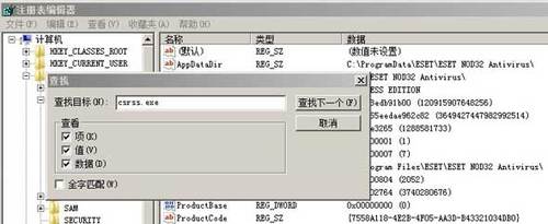 輸入病毒執(zhí)行文件名(csrss.exe)查找,直到找到病毒執(zhí)行文件(鍵值中的目錄[C:\Windows\csrss.exe]與在“Windows