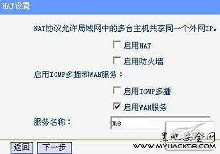 此外,對(duì)于ISP限制了寬帶無(wú)線貓的路由的情況,可在此設(shè)置中啟用WAN口服務(wù)或者IGMP多點(diǎn)傳送(IP多點(diǎn)傳送是針對(duì)點(diǎn)到點(diǎn)的傳送和廣播傳送兩種方式而言的,它是指在一定的組內(nèi)對(duì)其成員進(jìn)行的廣播,是一種有限的廣播,組中的某個(gè)成員發(fā)出的信息,組中的其它所有成員都能收到)功能。也能讓2-3臺(tái)電腦都新建一個(gè)網(wǎng)絡(luò)連接,重復(fù)撥號(hào)同時(shí)上網(wǎng)。
