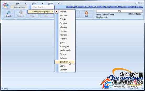 下圖所示為360數(shù)據(jù)恢復(fù)軟件的主界面,可以看到該軟件默認(rèn)顯示的是英文界面,相信很多人都不習(xí)慣使用外文軟件,好在該軟件內(nèi)置包括簡(jiǎn)體中文在內(nèi)的多國(guó)操作語(yǔ)言,用戶可以自行手動(dòng)切換至簡(jiǎn)體中文界面,如圖: