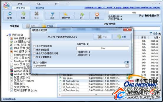 掃描過(guò)程完畢,并且用戶在過(guò)濾到具體的需要恢復(fù)的文件對(duì)象后,用戶點(diǎn)選需要恢復(fù)的文件,然后點(diǎn)擊“恢復(fù)”按鈕,可以看到下圖所示的一個(gè)配置選項(xiàng),用戶在此可以具體配置文件恢復(fù)參數(shù),比如文件恢復(fù)的保持路徑等,如圖: