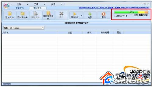 粉碎過(guò)程非常快速,下圖所示為筆者剛剛添加的文件夾已經(jīng)沒了,通過(guò)界面右上角的提示可知,那個(gè)文件夾已經(jīng)被徹底粉碎,如圖: