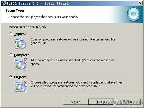 選擇安裝類型,有“Typical(默認(rèn))”、“Complete(完全)”、“Custom(用戶自定義)”三個(gè)選項(xiàng),我們選擇“Custom”,有更多的選項(xiàng),也方便熟悉安裝過(guò)程