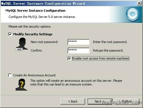這一步詢問(wèn)是否要修改默認(rèn)root用戶(超級(jí)管理)的密碼(默認(rèn)為空),“New root password”如果要修改,就在此填入新密碼(如果是重裝,并且之前已經(jīng)設(shè)置了密碼,在這里更改密碼可能會(huì)出錯(cuò),請(qǐng)留空,并將“Modify Security Settings”前面的勾去掉,安裝配置完成后另行修改密碼),“Confirm(再輸一遍)”內(nèi)再填一次,防止輸錯(cuò)!癊nable root access from remote machines(是否允許root用戶在其它的機(jī)器上登陸,如果要安全,就不要勾上,如果要方便,就勾上它)”。最后“Create An Anonymous Account(新建一個(gè)匿名用戶,匿名用戶可以連接數(shù)據(jù)庫(kù),不能操作數(shù)據(jù),包括查詢)”,一般就不用勾了,設(shè)置完畢,按“Next”繼續(xù)。