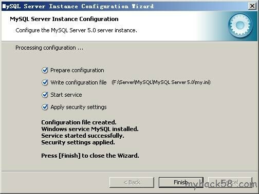 設(shè)置完畢,按“Finish”結(jié)束mysql的安裝與配置——這里有一個(gè)比較常見的錯(cuò)誤,就是不能“Start service”,一般出現(xiàn)在以前有安裝mysql的服務(wù)器上,解決的辦法,先保證以前安裝的mysql服務(wù)器徹底卸載掉了;不行的話,檢查是否按上面一 步所說(shuō),之前的密碼是否有修改,照上面的操作;如果依然不行,將mysql安裝目錄下的data文件夾備份,然后刪除,在安裝完成后,將安裝生成的 data文件夾刪除,備份的data文件夾移回來(lái),再重啟mysql服務(wù)就可以了,這種情況下,可能需要將數(shù)據(jù)庫(kù)檢查一下,然后修復(fù)一次,防止數(shù)據(jù)出錯(cuò)。