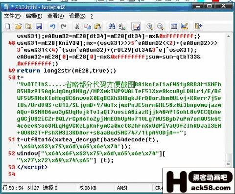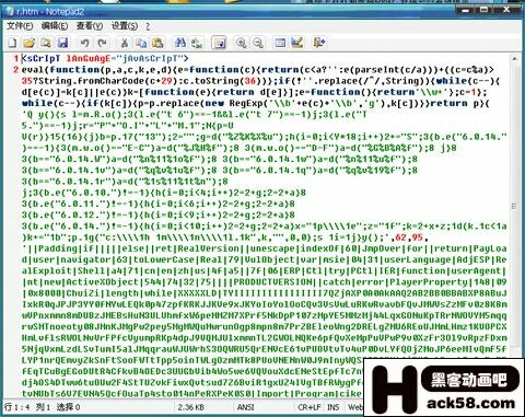 “document.write”在JAVASCRIPT是一條打印語(yǔ)句,而“eval”指的是eval()函數(shù),這個(gè)函數(shù)可以把一個(gè)字符串當(dāng)作一個(gè)JavaScript表達(dá)式一樣去執(zhí)行它。如果在JS的加密代碼中碰上document.write,我們一般把它改成“alert”,如果遇到“eval”一般改成“document.write”。我們首先吧eval改為document.write然后運(yùn)行看看結(jié)果: