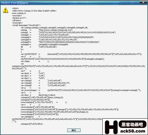 意思就是調(diào)用pass驗(yàn)證函數(shù),如果為真,就繼續(xù)執(zhí)行里面的內(nèi)容。XOR是運(yùn)算符,對(duì)兩個(gè)表達(dá)式進(jìn)行邏輯“異或”運(yùn)算。這里就不詳細(xì)了解了。關(guān)鍵是最后的Document.write(cuteqq3)了解網(wǎng)頁(yè)代碼的人就知道這段具體的意思就是,如果密碼驗(yàn)證正確。就輸出cuteqq3這個(gè)函數(shù)里的內(nèi)容。當(dāng)我們遇到document.write的時(shí)候我們一般把它改成“alert”得到初步解密: