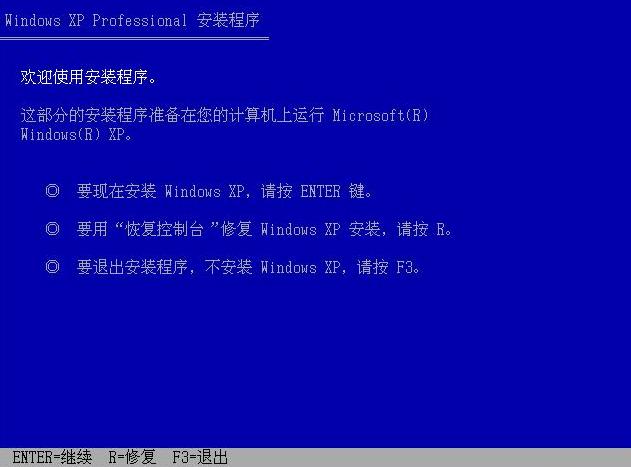 設(shè)置BIOS為光驅(qū)啟動并從光盤啟動WinXP安裝光盤,出現(xiàn)“歡迎使用安裝程序”的界面時按下“R”