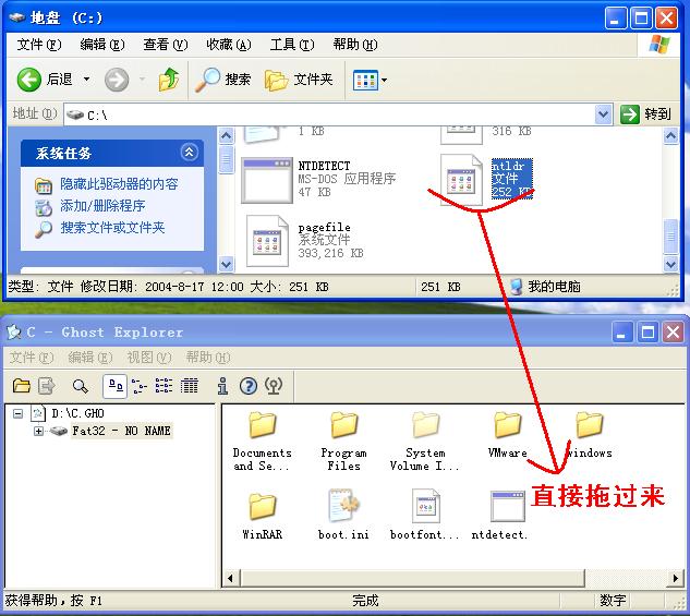 一般那些改版的XP都會集成備份和還原系統(tǒng)的的功能,那么就先用它幫原來的系統(tǒng)即時做一個GHO備份,然后再安裝Ghost光盤上的系統(tǒng)(只是作為一個過渡作用),安裝完后其它什么都不用管,直接用Ghost瀏覽器(一般Ghost版系統(tǒng)的目錄里都有,或者到這里下載http://www.bibidu.com/fileview-247483.html)打開剛才備份的GHO文件,在新系統(tǒng)的C盤下找到ntldr(需要在“文件夾選項”里取消“隱藏受保護(hù)的操作系統(tǒng)文件”的勾選并勾中“顯示所有文件和文件夾”)直接拖到GHO文件的C盤下,然后再把恢復(fù)了ntldr的原系統(tǒng)的備份文件還原回去就OK了。