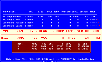 這是硬盤情況,剛才我們檢測到的硬盤參數(shù)在這里可以看到,這時只有一個硬盤,4335M,有時我們安裝了多個硬盤時,想去掉一個硬盤,就要在這里操作,將光標移動到這里,然后按Page up,將其選擇為NONE即可。
