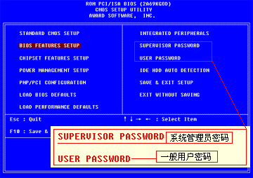 在CMOS里有兩個設置密碼的地方。一個是高級用戶密碼,一個是一般用戶密碼。