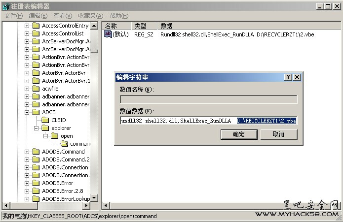 接下來(lái)又遇到幾個(gè)反復(fù)清除的問題反饋,經(jīng)過(guò)檢查發(fā)現(xiàn)這些電腦普遍都存在一個(gè)看上去不是很合理的RunOnce病毒啟動(dòng)項(xiàng).看到ADCS:\\Windows\\system32\\debug.exe第一印象是是不是病毒作者寫錯(cuò)了,第二印象Windows\\system32\\debug.exe(根據(jù)我的猜測(cè)這個(gè)只是為了繞過(guò)安全軟件檢測(cè),因?yàn)橹赶虻奈募钦5?這個(gè)文件是不是存在問題,但是到sys32目錄下查找這個(gè)文件明明是系統(tǒng)文件沒問題.最終依然將目光轉(zhuǎn)移到ADCS:打開注冊(cè)表HKEY_CLASSES_ROOT,顯然最終目的是運(yùn)行病毒文件D:\\RECYCLERZT1\\2.vbe