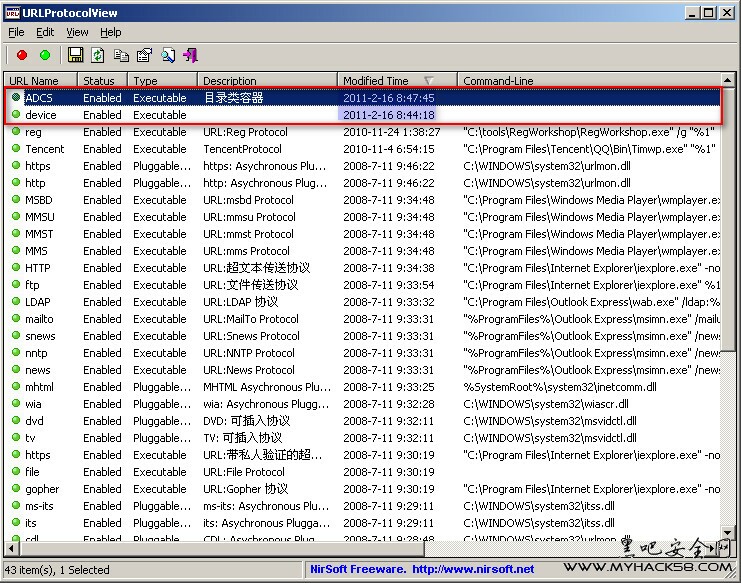 URLProtocolView:一個(gè)小工具可以查看電腦里面所有的URL Protocols,運(yùn)行URLProtocolView以后按照修改時(shí)間排列如圖馬上就發(fā)現(xiàn)可疑項(xiàng)目ADCS和device.