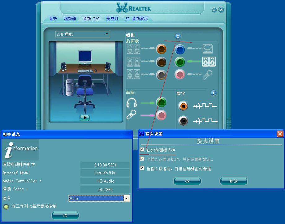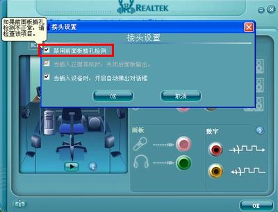 部分驅(qū)動版本的“接頭設(shè)置”第一項會顯示為“AC 97'前面板支持”,而不是“禁用前面板插孔檢測”,這也是正常的,因為只有HD Audio規(guī)格的前面板才支持插孔檢測功能。