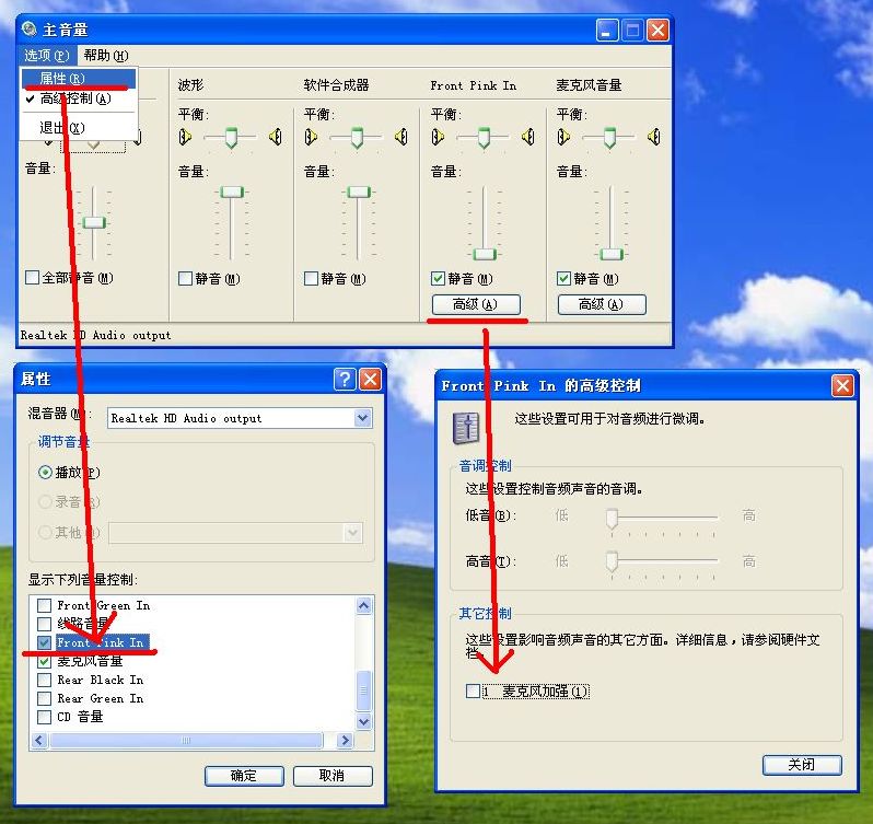 由于Realtek現(xiàn)有音頻驅(qū)動未統(tǒng)一對驅(qū)動各功能塊的中文稱謂,甚至英文稱謂,在使用時稍有不變,大家一例操作即可。例如前置麥克風(fēng)目前的英文名叫常見的是Front Pink In(前置粉紅色輸入)、Front Mic(前置麥克風(fēng));后置麥克風(fēng)之前一直都是“麥克風(fēng)音量”的,最近幾款驅(qū)動不知什么原因變了,目前見過的幾個英文名有Rear Pink In(后置粉紅色輸入)、Rear Purple In(后置紫色輸入)等。