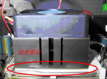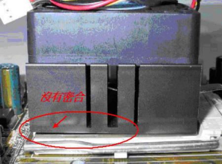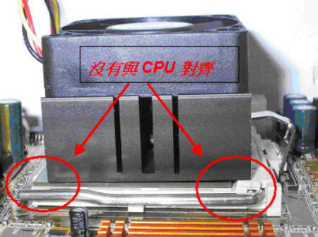 五、若是安裝順序或方向錯誤時,則CPU與CPU風(fēng)扇無法確實密合,如下圖所示。此時CPU風(fēng)扇沒有確實與CPU核心主體接觸,無法達(dá)到散熱效果,容易導(dǎo)致CPU過熱而當(dāng)機(jī)。因此必須將風(fēng)扇拆下重裝,拆下時請?zhí)貏e注意,不當(dāng)?shù)氖┝䦟PU本體壓壞,導(dǎo)致CPU損毀而無法正常工作。
