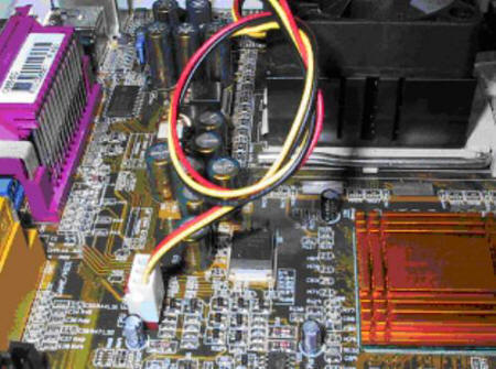 六、最后安裝CPU風(fēng)扇的電源線,注意:不要讓電線纏住CPU風(fēng)扇葉片,而導(dǎo)致風(fēng)扇不運(yùn)轉(zhuǎn),使風(fēng)扇失去作用。