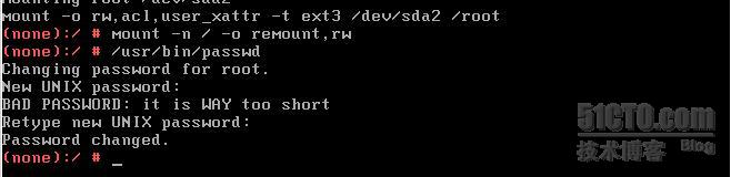 7、修改完成后輸入 mount -n / -o remount,ro,將根文件系統(tǒng)設(shè)為原來的狀態(tài)