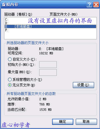 第七步:虛擬內(nèi)存一般設(shè)置C盤之外的硬盤上,選擇你剩余空間比較大的硬盤,那么我選擇了E盤,再點一下下面的自定義大小