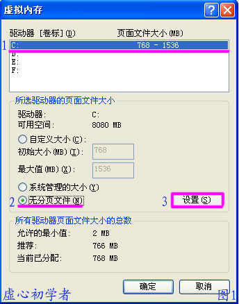 第一步:在原有的虛擬內(nèi)存驅(qū)動器上點一下,再點下面的“無分頁文件”,再點右側(cè)的“設(shè)置”,這樣是取消原來的設(shè)置。