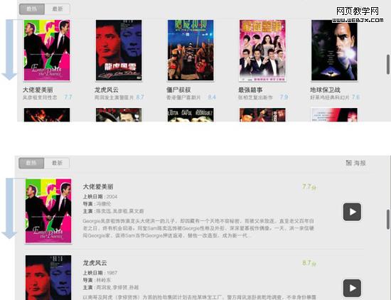 迅雷看看HD的視頻展示界面處理得很好,海報(bào)形式到列表形式之間的相互切換能記憶住用戶瀏覽的位置。譬如下圖所示,我在列表視圖下看到了“大佬愛(ài)美麗”這一行,切換到海報(bào)視圖的時(shí)候仍然是從“大佬愛(ài)美麗”開(kāi)始。