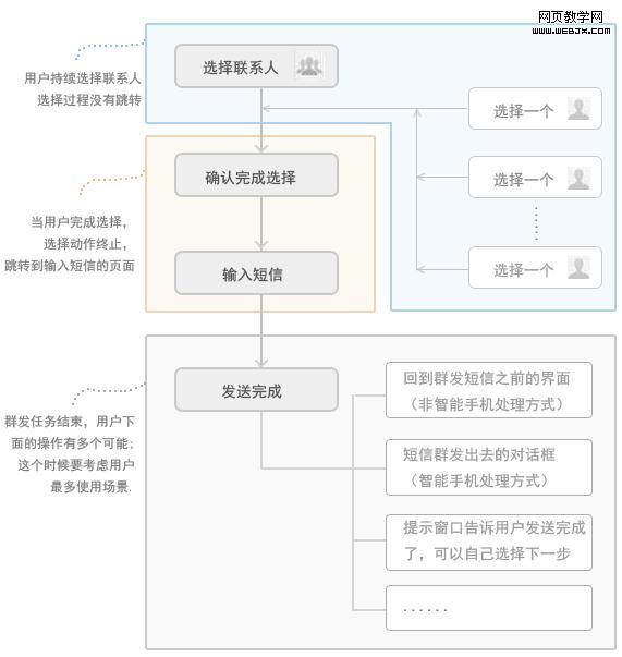 選擇聯(lián)系人的時(shí)候?qū)儆诘谝环N情況,選擇一個(gè)聯(lián)系人之后還會(huì)繼續(xù)選擇;完成選擇屬于第二種,選擇動(dòng)作終止,需優(yōu)先要考慮自動(dòng)跳轉(zhuǎn);發(fā)送完成之后,個(gè)人更喜歡智能手機(jī)的處理方式,跳轉(zhuǎn)到短信群發(fā)對(duì)話框,能直觀地看到短信發(fā)送成功失敗的信息。