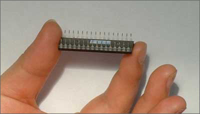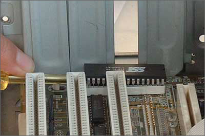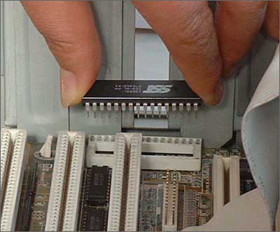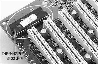 這里順便提一下,在通常情況下,取下BIOS芯片需要芯片起拔器。對于采用DIP封裝的BIOS芯片,采用起拔器還顯得不是很重要,但是采用PLCC封裝的BIOS芯片,如果不使用起拔器,是很難取下的。起拔器一般在電子市場可以買到。對于沒有起拔器的情況,我們可以采用修眼鏡和鐘表的那種小改錐來代替,筆者一直使用這種方法,只要你在起拔的時候認真小心,還是很安全的。對于使用DIP封裝的BIOS芯片,起拔的時候要先將改錐一側(cè)撬起少許,然后再撬另外一邊,反復(fù)重復(fù)這個過程,直到芯片完全取出。對于采用PLCC封裝的BIOS,需要使用改錐從芯片對角線的凹槽起拔,并且要加倍小心,因為PLCC封裝比DIP封裝更容易損壞。