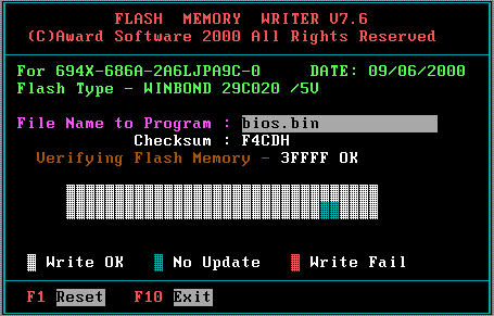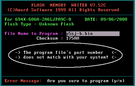 在很長的一段時間里,筆者也曾經(jīng)受到了"一定要看清楚主板型號是否相同""芯片組不同是絕對不能刷新"這樣的文字的蠱惑,對于其中的原理也沒有多思考,直到這個暑假一個朋友的一塊使用KT266A芯片組的主板BIOS更新失敗的情況下,我才進行了上面的思考的。當時在工程施工工地上,條件非常有限,找不到相同型號的主板,筆者找來一塊打字室的BX的老板,嘗試用這樣的方法強行將KT266A的某品牌主板修復(fù)。