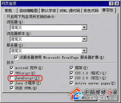 如何設(shè)置呢?單擊“工具”菜單,選擇“網(wǎng)頁選項(xiàng)” 然后單擊 “兼容性” 選項(xiàng)卡。 要禁止javascript,就取消“javascript”復(fù)選框,單擊“確定”,設(shè)置就完成了。//本文來自電腦軟硬件應(yīng)用網(wǎng)