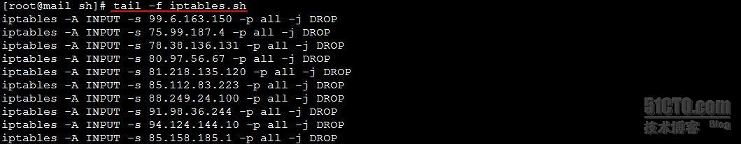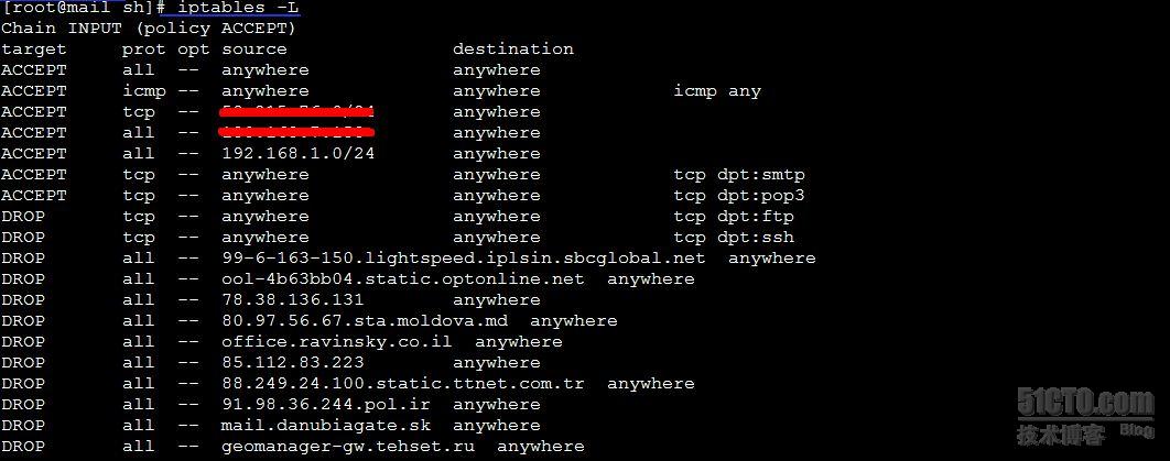 最后用iptables -L查看已經(jīng)把這些IP成功添加到Linux系統(tǒng)的Iptables防火墻策略里面,并且給DROP掉了。