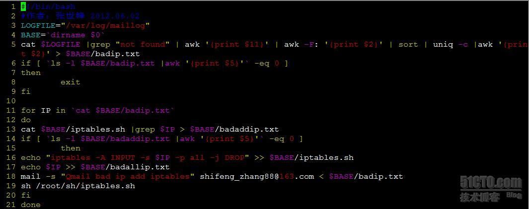 腳本的邏輯結(jié)構(gòu)大致是:分析統(tǒng)計系統(tǒng)maillog日志,取出攻擊者的IP地址,然后和服務器的Iptables腳本(iptables.sh)作對比,如果該IP地址沒有在iptables.sh里面,添加一條DROP的策略到iptables.sh,然后發(fā)送一份郵件給系統(tǒng)管理員,并重新加載iptables.sh。