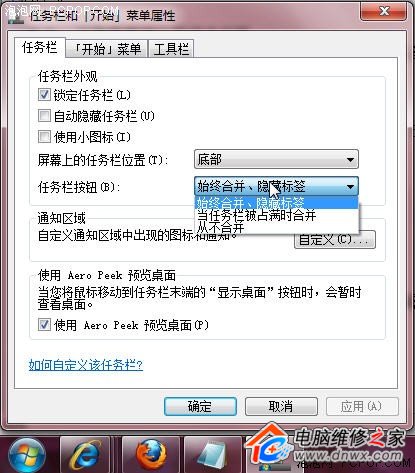 在任務(wù)欄空白處點(diǎn)擊右鍵選擇“屬性”,如上圖中選擇“從不合并”即可。同時(shí),您也可以在此開啟任務(wù)欄小圖標(biāo)。至于桌面圖標(biāo)大小,您只需按住Ctrl,然后滾動(dòng)鼠標(biāo)滾輪即可。