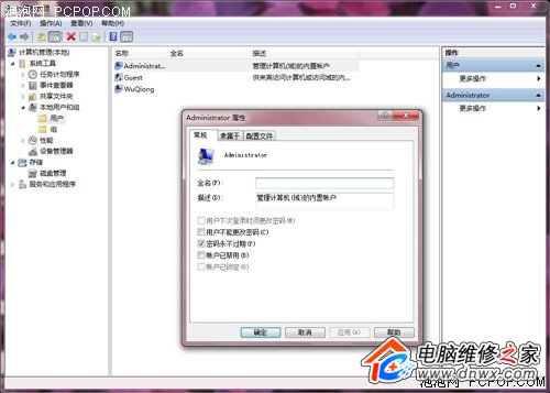 在“我的電腦”上右鍵,依次選擇“管理”、“本地用戶和組”、“用戶”,選擇Administrator用戶,右鍵選擇屬性,取消禁用狀態(tài)即可(如上圖)。