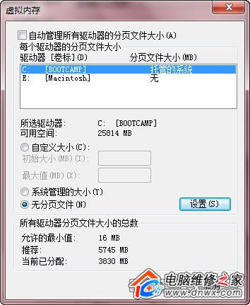 取消最頂端的“自動(dòng)管理”,選擇系統(tǒng)分區(qū)(即C盤),無(wú)分頁(yè)文件,點(diǎn)擊設(shè)置,保存,推出并重啟即可。