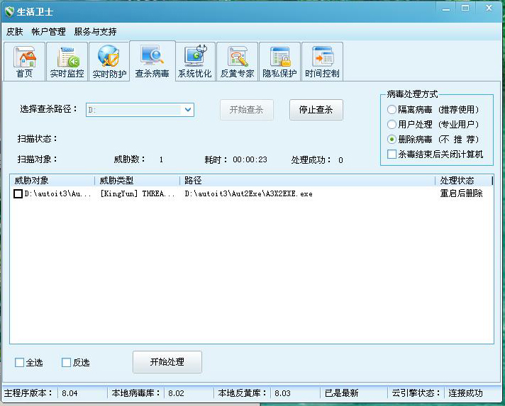 2、多種處理方式:隔離病毒、用戶處理、直接刪除等.