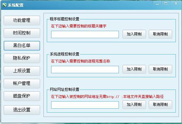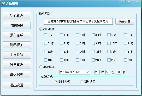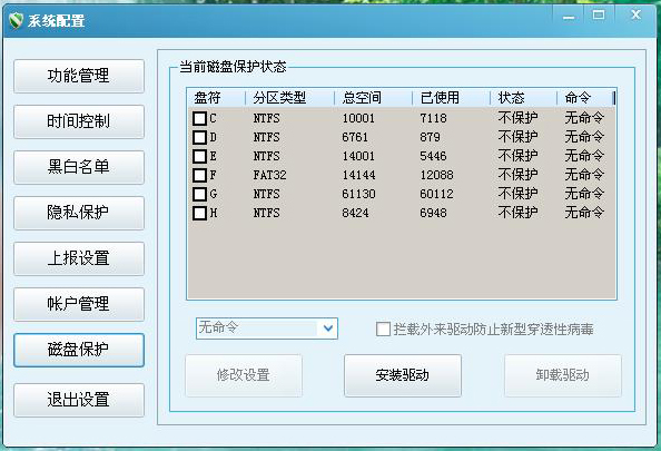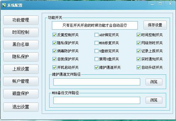 病毒防護(hù)、反黃控制、時(shí)間控制、隱私保護(hù)、記錄上報(bào)、U盤鎖定、